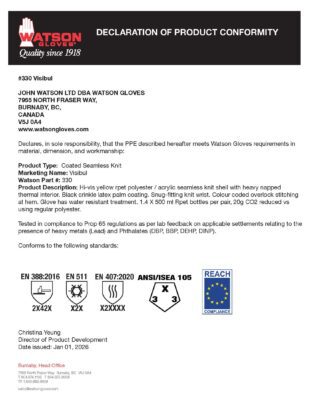 Couche intérieure duvetée isolante, tricotde polyester avec WasteNot🅪 de 7 jaugesfabriqué à 17% de bouteilles PET recycléespostconsommation, paume enduite d’un caoutchoucde latex résistant, fini texturé offrant une excellenteprise, « Soyez vu, soyez en sécurité » avec cettecouleur jaune sécuritaire haute visibilité, traité pourque l’eau perle et ne pénètre pas jusqu’à 5 lavages,poignet en tricot ajusté