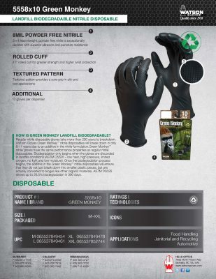 Ils se dégradent entièrement en 10 ans dans des conditions modérées de mise en décharge (ASTM D5526), contre 200 ans pour des gants jetables ordinaires. Les gants présentent une biodégradation de 26,5 % en 390 jours. Une fois la biodégradation commencée, les gants sont convertis en biogaz et créent de l'énergie pour alimenter nos maisons, nos entreprises et nos communautés.