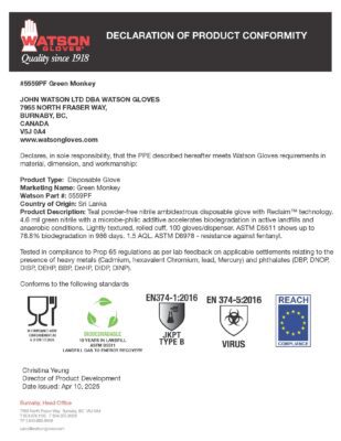 *Les gants se dégradent entièrement en 8 à 11 ans dans des conditions de décharge modérées (ASTM D5511), contre 200 ans pour des gants jetables ordinaires. Les gants présentent une biodégradation de 78 % en 986 jours. Une fois la biodégradation commencée, les gants sont transformés en biogaz et créent de l'énergie pour alimenter nos maisons, nos entreprises et nos communautés.
