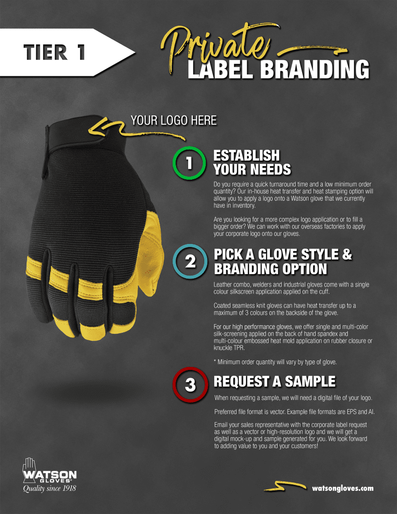 Promouvoir l'identité de votre entreprise - votre "empreinte digitale" unique qui vous différencie de la concurrence - et toucher un public plus large. Notre programme de gants de co-marquage ajoute de la valeur en associant notre savoir-faire de qualité et notre marque bien connue à l'ajout du logo de votre entreprise. Ces gants peuvent être utilisés comme cadeaux d'appréciation pour les vendeurs et les clients, comme programmes de récompense pour les employés, comme outils de vente, comme produits de vente au détail et comme vêtements de sécurité pour les employés.