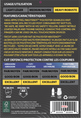 18gg cut resistant HPPE/glass/polyester shell The knitted liner is comprised of 21% (+/- 2%) WasteNot™ polyester (rPET 12% by total… Read more »