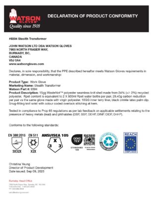 15gg seamless knit liner is comprised of 31.8% (+/- 2%) WasteNot™ polyester (21% rPET by total glove weight) which is made from recycled post consumer PET bottles